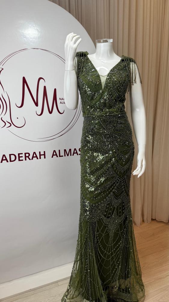 فستان تول زيتي طويل بقصّة مستقيمة مزين بالترتر والخرز