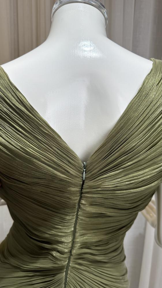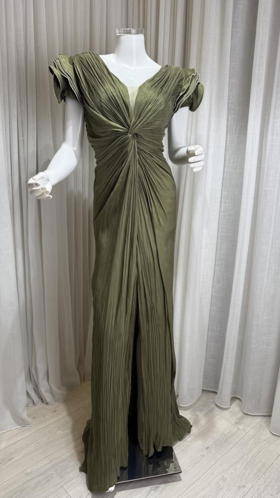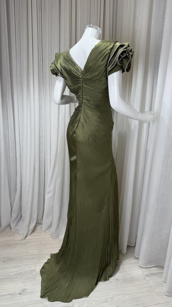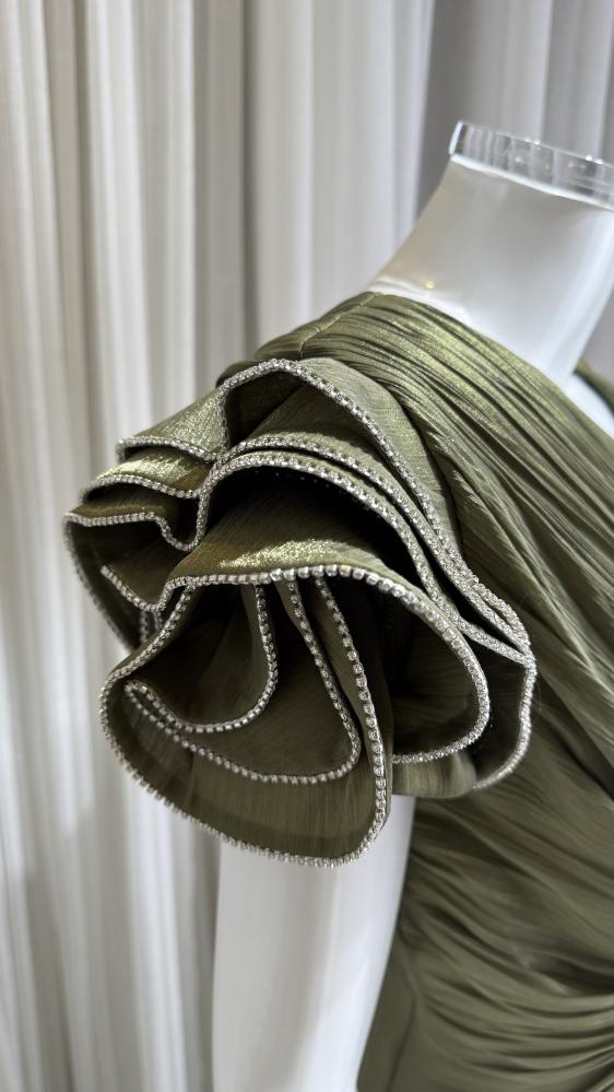 فستان شيفون زيتي درابيه على الصدر وأكمام على شكل ورد بنهايات فضية